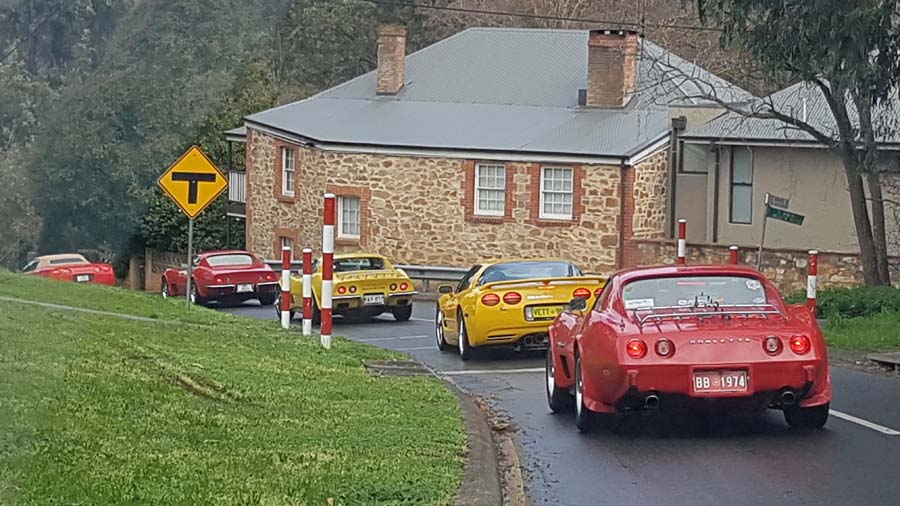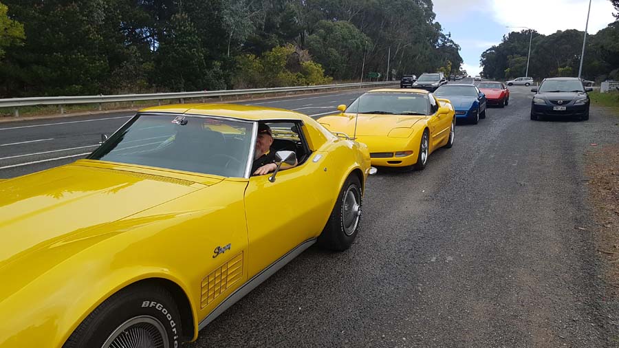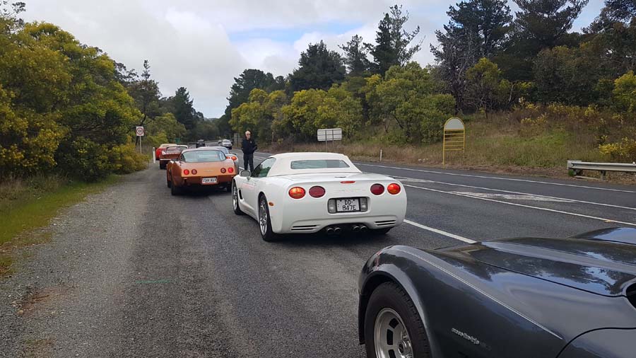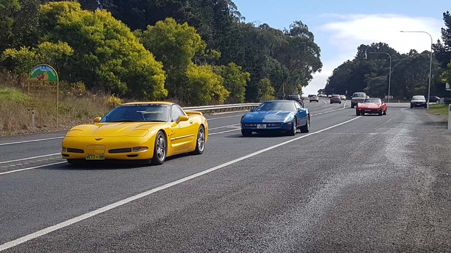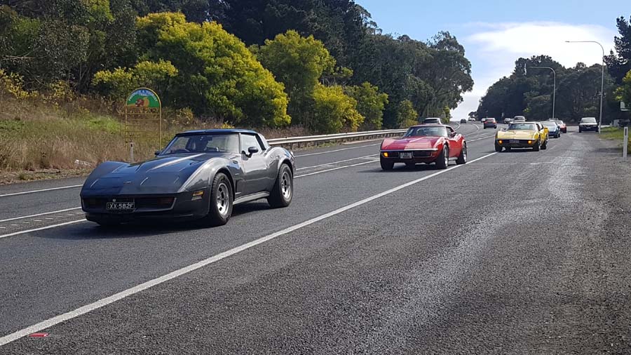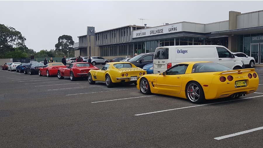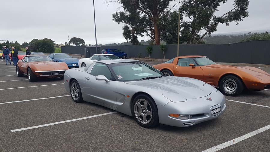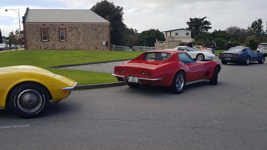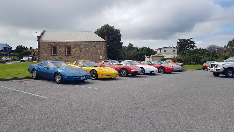 The run was to be a joint Corvette, Vincent and Honda CBX motorcycle Club event but the forecast cool day with showers and windy conditions meant the motorcycle contingent had a rethink with some, including me, opting for 4 wheels and others deferring to a better day for a ride.  Unfortunate but as one remarked, “we’re motorcyclists, not masochists.”  12 Corvettes and half a dozen daily drivers met at the Victoria Hotel on Main South Road for a 10:30 run of approx 130 Km to the Middleton Tavern for lunch.  AJ gave the briefing & handed out goodie bags of sweets to keep us nourished on the journey.